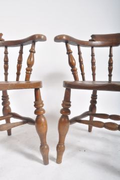 A pair of Victorian 19th century beech and elm wood smokers bow captain's armchairs. The armchairs having a shaped head & backrest with scrolled arms, supported by turned baluster bead columns over single panel saddle seat. Raised on turned baluster supports united by H shaped stretchers. Measures approx. 79cm x 63cm x 50cm.