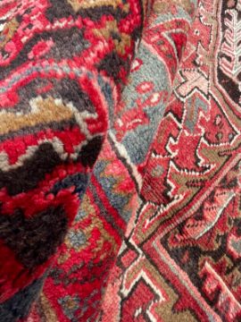 A 19th century Central Persian Islamic Heriz hand woven floor carpet rug, having a central panel with graduating central medallions in stylized forms on red & white grounds. Enclosed within graduating outer borders. Some wear. Measuring approx. 383cm x 282cm.