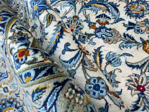 An early 20th century Central Persian Islamic Kashan floor carpet rug in pastel green shades. The rug having a central panel decorated with intricate foliate & floral patterns in ochre & blues enclosed within a series of graduating outer borders with similar patterns in darker shades. Tassels to ends. Measures approx. 333cm x 230cm.