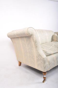 A 20th century upholstered Chesterfield three seater sofa in the manner of Howard & Sons. The sofa having a straight back with scrolled upholstered elbow rests, raised on mahogany supports with brass front castors. All upholstered in damask blue & satin fabric. Measures approx. 86cm x 168cm x 85cm.