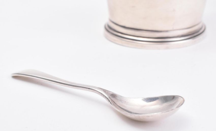 A hallmarked silver lidded mustard pot with glass liner and spoon. The mustard pot of graduating circular form raised on a stepped base with matched stepped detail to lid. Fitted blue glass liner to the interior and together with a condiment spoon. Pot hallmarked for Birmingham 1941, makers marks for A Bros - Adie Brothers Ltd. Spoon hallmarked for Birmingham 1973. Total weight excluding glass liner 46.5g. Measures approx. 4cm.