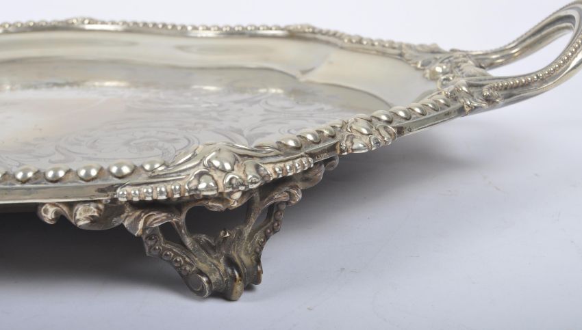 An oversized 19th century large silver plated salver tray. The tray being raised on s-scroll terminal feet with a heavy beaded gallery edge with handles either end. Rococo chased design centre with central large vignette of a rampant lion bearing arrow pointing down. Measures approx. 72cm x 51cm.
