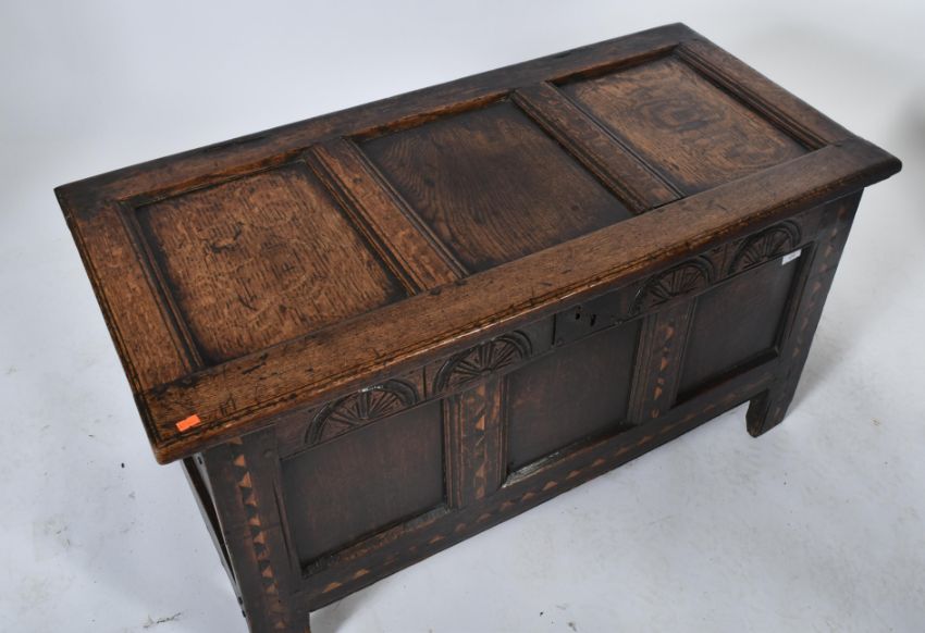 A 17th century inlaid oak coffer / blanket box / chest. The coffer having a hinged top over a carved frieze below with geometric fan shaped decoration. Three panels below with triangular inlays surround. Raised on straight supports. Measures approx. 60cm x 112cm x 54cm.