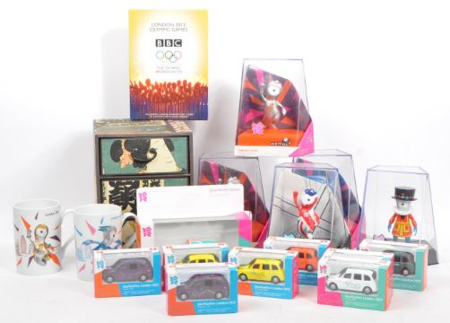 A collection of official products of London 2012 Olympics memorabilia to include; Ceramic mugs x 2, BBC The Olympic Broadcaster DVD's x 2, Precision diecast models - Mini car, London Taxis - various designs (Judo, Cycling, Modern Pentathlon, Badminton, Taekwondo, Sailing, Beech Volleyball, Hockey), Wenlock - official pose x 2/ Union Flag, Mandeville - official pose / beefeater.  Along with 20+ pin badges of varying designs. Most boxed with contents unused.