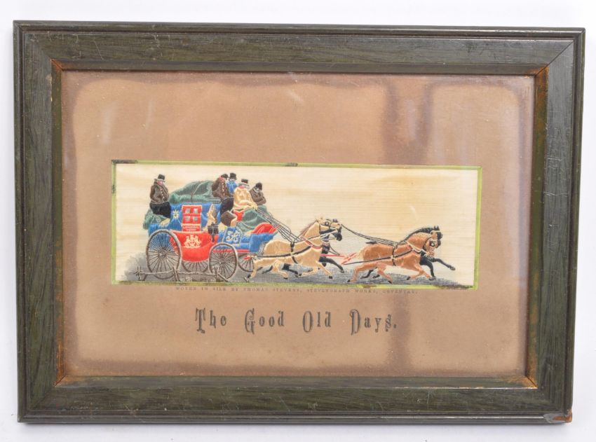 A collection of 19th century Victorian circa 1860s commemorative and devotional embroidered silk framed Stevengraphs to include three cart and horse scenes to include 'The Good Old Days', The "London & York" Stage Coach Commenced Running in the year 1706, From the Black Swan Holborn, London, To The Black Swan Coney Street, York and another for Coventry and Midland Manufacturing Industrial and Art Exhibition Opened June 1867: The Rt Hon Lord Leigh President: Stoneleigh Abbey'. Each embroidered with various accompanying designs and portraits. Majority framed and glazed. Measures 39cm length.