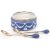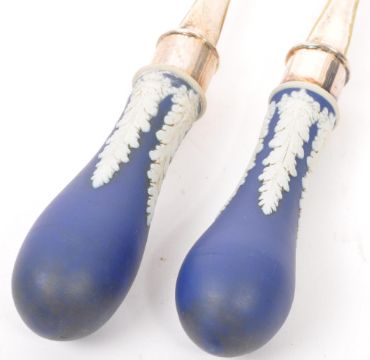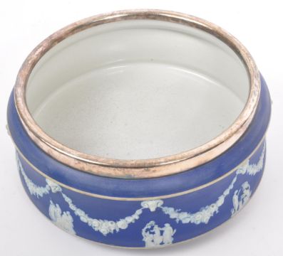 An early 20th Century English antique ceramic salad bowl with matching silver plate rim (silver on nickel)and matching silver plate servers by Josiah Wedgwood & Sons. Each having blue and white decoration central floral medallion and leaves with scroll and geometric borders.  Each stamped to reverse. Measures: 23cm (diameter).