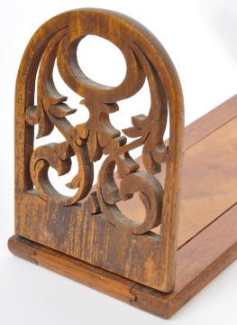 A 19th century Victorian extendable walnut book stand. With dovetail supports to base, with twin hinged pierced upright arched book holders of geometric shaped pattern. Measures approx. 55cm long (extended)
