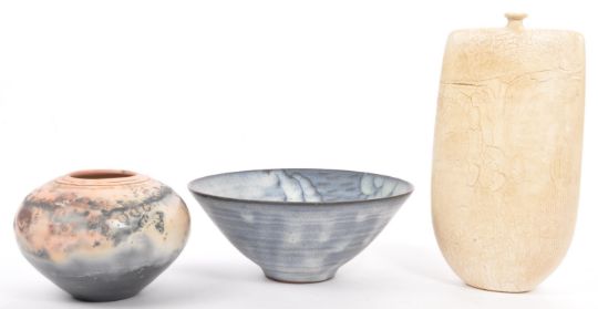 A collection of contemporary Australian studio art pottery. Comprising of Saggar fired ceramics bulbous body with marble effect, another deep dish bowl with stone effect. Together with a tapering rectangular stone effect bottle. Tallest measures approx. 20cm