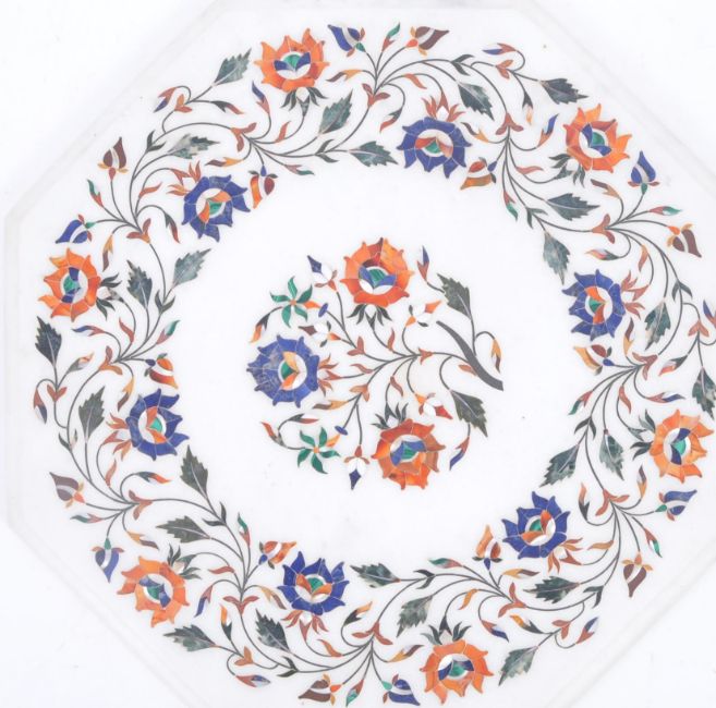A 20th century Indian alabaster inlaid marquetry pietra dura octagonal occasional side table top. The alabaster top decorated with semi precious florally shaped decorations. Measures approx. 39cm x 39cm x 2cm.