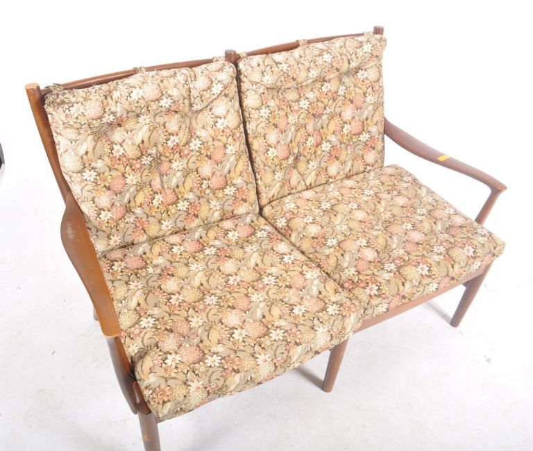 A retro mid 20th century teak framed Parker Knoll two seater settee sofa. The sofa having a slatted back over propeller elbow rests raised on tapering supports. Foliate upholstered cushions. Measures approx. 81cm x 118cm x 49cm.
