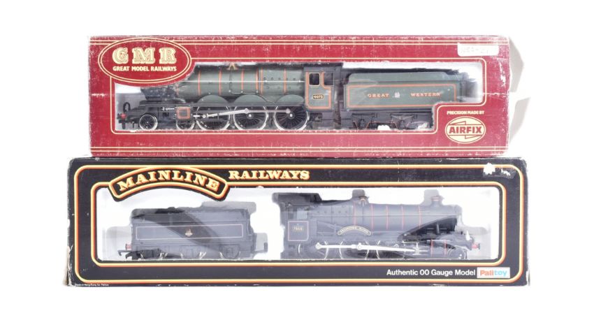 Two vintage OO gauge model railway trainset steam locomotive engines comprising; Mainline Railways No. 37-079 4-6-0 Manor Class 'Erlestoke Manor' in BR Black and Airfix GMR 'Caerphilly Castle'. Housed within original boxes.