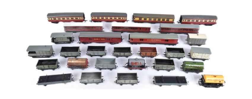 A collection of assorted vintage OO gauge model railway trainset rolling stock from a variety of makers, such as Hornby Dublo, Hornby, Triang and Graham Farish. To include: a Hornby Dublo W807 'Royal Mail' coach 3-rail, a Graham Farish wagon, a Triang R23 'Royal Mail' coach and others. All unboxed.
