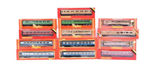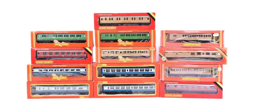 Model Railway - a collection of x13 Hornby OO gauge model railway trainset locomotive rolling stock coaches / carriages to include; R726 BR Inter-City Brake 2nd Coach, R477 LNER Composite Coach (teak finish), R391 LNER Clerestory Composite Coach and others. Housed within original boxes.