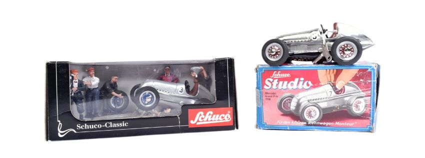 Schuco - x2 Schuco made tinplate clockwork models comprising; 1050 Mercedes Grand Prix 1936 (with key) and a Schuco Classic set No. 01070 racing car studio diorama with x5 mechanic figures. Housed within original boxes.