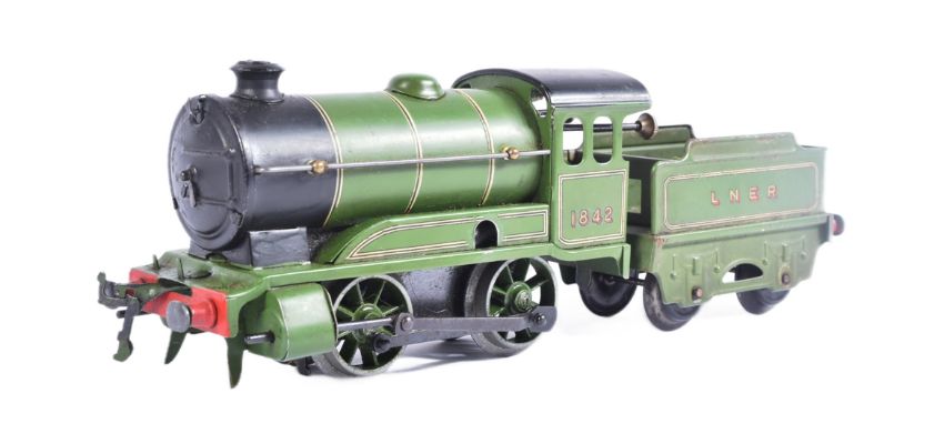 Model Railway - a vintage Hornby O gauge tinplate electric model railway trainset locomotive engine No. '1842'. The loco being a 0-4-0 example in green livery with LNER tender.