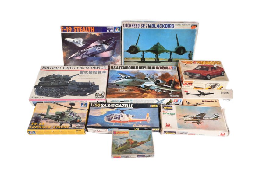 Collection of vintage assorted model kits of transport and aircraft interest, from various makers such as: Italeri, Tamiya, Hasagawa and others. Model kits to include: Heller No. 484 SA 341 Gazelle 1/50, Hasagawa K16 Lockheed SR-71A Blackbird 1/72 , Italeri No. 819 F-19 Stealth 1/48 and others. Housed within their original boxes.