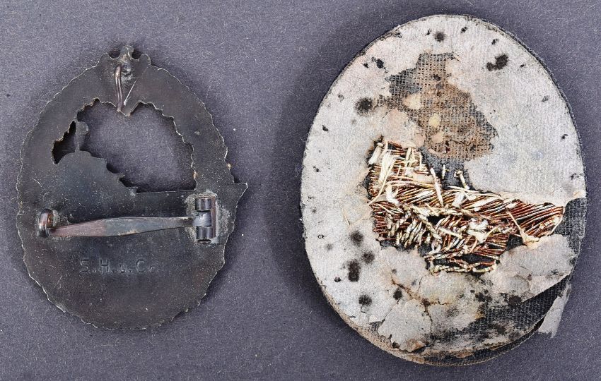 A WWII Second World War Third Reich Nazi German Kriegsmarine Destroyer badge with cloth patch. The badge depicting the side-view of a destroyer cutting through a wave surrounded by an oak leaf wreath with eagle and Swastika emblem. Maker's mark to the reverse S. H.u. Co and the patch sewn from bullion thread.