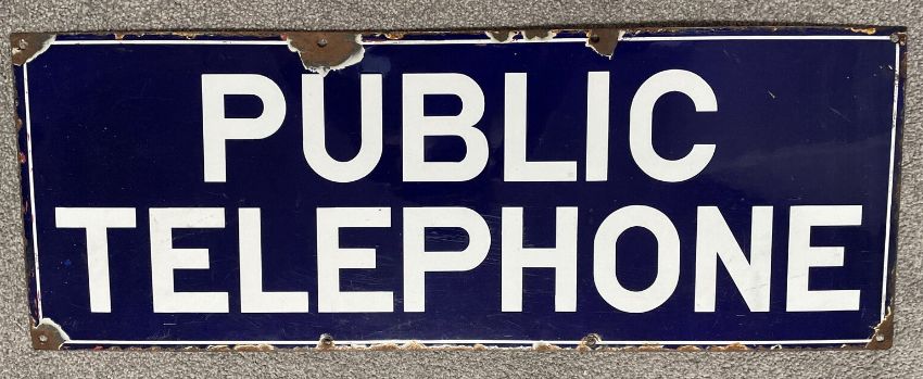 Large early 20th century advertising point of sale shop enamel public telephone sign. Blue ground with white notation reading ' Public telephone '. The lot with minimal signs of wear over time, the usual rust spots, all the rust has been chemically treated to inhibit growth & sealed with waterproof lacquer. All 8 fixing holes are good load-bearing ones. Measures approx. 84cm x 31cm.