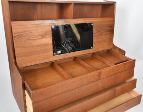 A retro mid 20th century Danish teak secretary desk cabinet . The cabinet having a fully appointed top wit cupboard spaces atop over central pigeonhole flanked by sliding doors. Desk top below over beehive shaped chest of four drawers. Raised on squared tapering supports. Illegibly marked to back. Measures approx. 128cm x 119cm x 48cm.