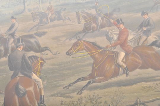 Engraved by William Summers (British School, 1816-1880) after painting by John Sturgess (1839 - 1903) - 'Fox-Hunting Plate 3. Over a Stiff Country' - a mid-late nineteenth century Victorian coloured engraving depicting a large fox hunting party outside a village, featuring horses and red coats. Marked to lower right hand corner, engraved by W. Summers, A. Stiefbold & Co, Berlin. Published London 1876. Measures approx. 134cm x 82cm.