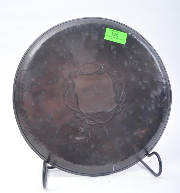 A late 20th century vintage Cornish copper and white metal wall charger, with candy striped rim and central naïve leaf motif in white metal. Signed to base 'P. G. Cornwall 1980'. Measures approx. 28cm in diameter.