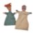 Two early 20th century c1920s / 1930s hand puppets, being a figure with long hooked nose and curly red fabric hair in a green dress, and a black male figure with oversized features in a beige outfit. The male figure's head is detached but present. Longest measures approx. 33cm.