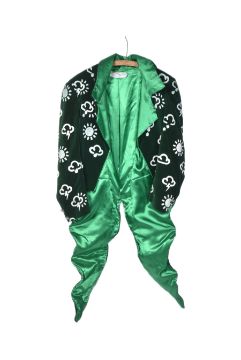 Forkbeard Fantasy - Met Man – an original production used custom made green velvet weatherman type coat and tails as worn in The Exeter Torch Relay Olympics, 2012. Green velour, with cloud symbols all round. Weather themed buttons. Original label to interior, with actor's name present. Size appears a M.