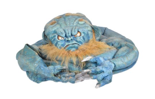 Forkbeard Fantasy - Yallery Brown - Royal & Derngate, Northampton - a half-torso blue monster puppet head. . Hand painted, with inset hair and yellow eyes. Measures approx. 90cm wide x 65cm deep.