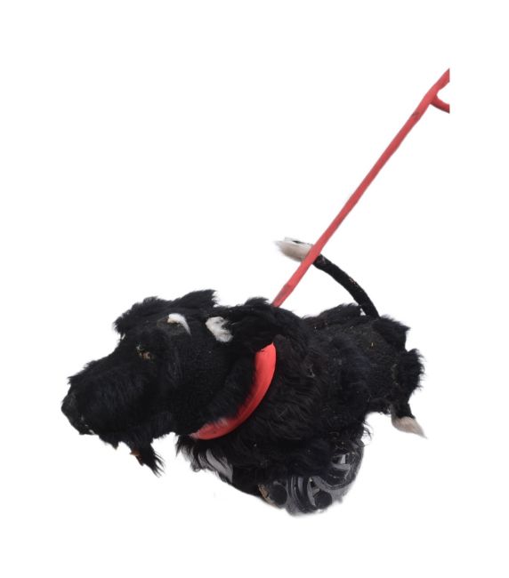 Forkbeard Fantasy - a 'lifesize' black dog street theatre puppet on wheels with a fixed rod lead. Wheels to base, with fur covering and a red covered fixed lead. Measures approx. 70cm tall, total length including lead: 140cm.