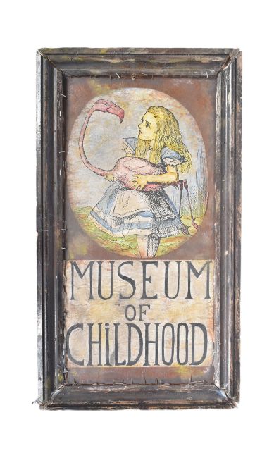 Forkbeard Fantasy - Museum of Childhood - Barbers Of Surreal (1998) - a custom made stage prop sign, hand-painted over printed artwork and featuring Alice in Wonderland to the top. Measures approx. 69cm x 39cm.