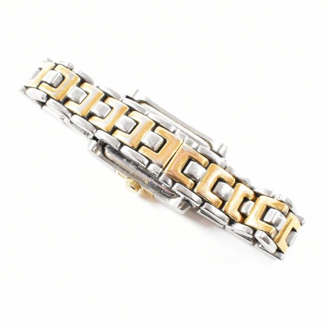 A Rotary Savannah two tone stainless steel wrist watch. The bicoloured yellow gold and silver tone metal watch having a rectangular sunburst guilloche enamel style rectangular dial with black Roman numeral indices and blued sword hands to a two tone case and bracelet strap. Marked to verso REF: 10480-BATT:UC.379. Total weight approx 56.8g. Case including crown measures approx 2.5cm. Not ticking at time of cataloguing. In box with paperwork and spare link.