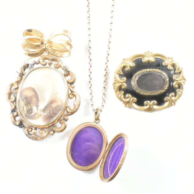 A selection of 19th century century jewellery. The jewellery to include a locket on chain the locket having grape and foliate decoration strung upon yellow metal chain unmarked tests indicate gold in parts like rolled gold. A pinchbeck and enamel mourning brooch pin with glazed locket compartment. A hairwork locket brooch pendant AF with later bow brooch pin. Pinch-beck brooch pin measures approx 4.5cm. Chain measures approx 30cm, locket 3cm. Total weight 60g.