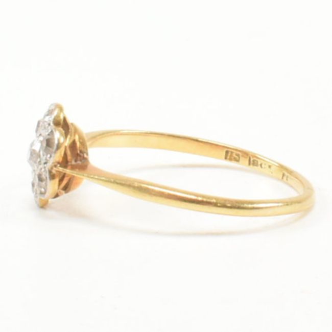 A 1920s 18ct gold and diamond cluster ring. The ring set with seven old cut diamonds in a flower cluster to tapering band. The band marked 15 18ct. Weight 2.3g. Size Q. All weights, measurements and sizes are approximate.