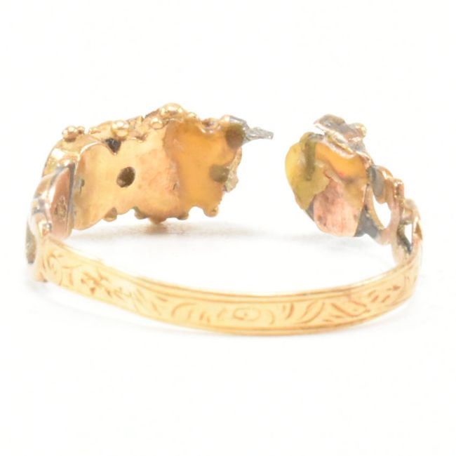 An AF Georgian gold, pearl and emerald ring. The ring having a central oval cut emerald flanked by a white pearl to each side with break to ring between on a pierced head and straight etched shank. Multiple signs of repair, damage, later additions and possibly resizing. Unmarked, tests indicate gold. Total weight approx 1.7g. Approx size N. presented In black tooled leatherette Garrard of London box.