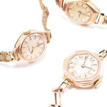 A collection of three 9ct gold cased ladies dress wristwatches. To include early 20th century dress watch with 9ct gold case on rolled gold strap, 9ct gold cased watch with expanding bracelet strap and a 9ct 17 Jewels Incabloc gold watch with yellow metal strap. Total gross weight 42.5g. Largest case including crown measures approx 2.3cm. All weights, measurements and sizes are approximate.