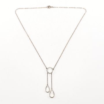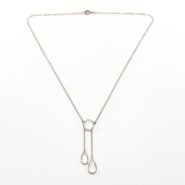 A 1920s silver aquamarine negligee necklace. The necklace strung with two pear cut aquamarine surmounted by round cut aquamarine to fine silver trace chain. Weight 2.8g. Measures 37cm chain. pendant drop 6.7cm. Round aquamarine 9.5x6.5cm. All weights, measurements and sizes are approximate.