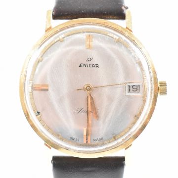 A vintage 18ct yellow gold Enicar Jubilé Swiss made wristwatch. The watch having a circular silvered dial with gold tone baton indices and pitched hands with date aperture to three in a round gold case to brown leather strap. Marked to verso Enicar jubile 18k 124 010 Swiss. Ticking at time of cataloguing. Total weight approx 38.5g. Case including crown measures approx 3.5cm.