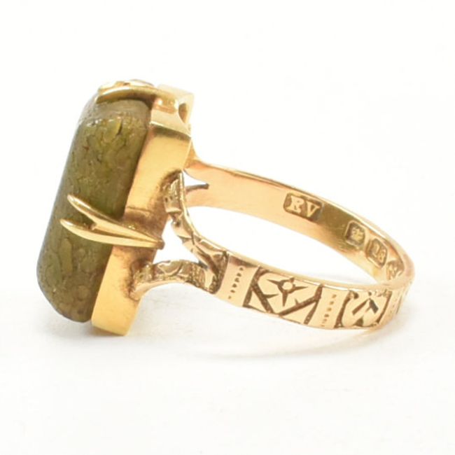 A hallmarked 18ct gold Victorian greenstone ring. The ring set with a green stone plaque to bifurcated shoulders and chased foliate decorated band. Hallmarked Chester 1879. Makers mark E.V. Weight 4.1g. Size N. All weights, measurements and sizes are approximate.