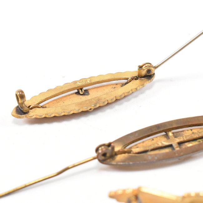 A collection of three antique gold plated and boxed brooch pins. The first pin having etched floral and scrolling design to C clasp verso and safety chain in tooled black leatherette box, the other two both having a central horseshoe motif flanked by blossom flowers and granulated detailing to the lozenge shape head, both to C clasps, marked RB and the other A.J.C, one in Goldsmith box. Total weight approx 59.3g. Largest measures approx 4.5cm.