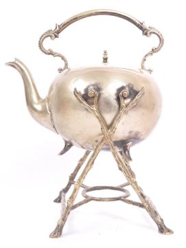 An early 20th century silver plated suspending hot water kettle, together with milk pot / jug. With scrolled carry handle, on a naturalistic branch frame. Measures approx. 28cm tall. No markings.