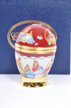 A collection of seven vintage 20th century & later Crummles hand painted English enamel trinket shaped boxes & bells. The lot to include an Easter bunnies enamelled copper egg, a limited edition ' Romance ' no. 33 of 250 box, a Royal Mail stamp enamel box. a limited edition ' Summer House ' no. 11 of 250 enamel box, together with three Crummles enamelled copper bells. Most with certificate of authenticity. All boxed.
