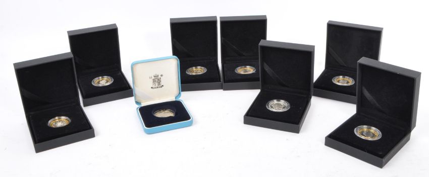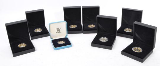 A collection of seven United Kingdom Queen Elizabeth II Bi-Metallic two pound coins. To include an original £2 coin symbolising the history of technological achievement (1998), The 350th Anniversary of the Guinea (2013), XIII Commonwealth Games Silver Proof Coin (1986) x 2, 100th Anniversary of the death of Florence Nightingale (2010), The Centenary of the London Olympic Games of 1908 (2008),   & 100th Anniversary of the Outbreak of the First World War (2014) and XIII Commonwealth Games (Cross of St Andrew, crown of laurel leaves and Scottish Thistle) - Silver Proof Coin. All housed in individual plastic coin capsules within their Royal Mint presentation boxes.
