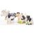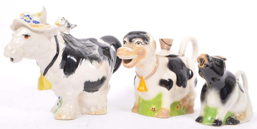 A collection of 20th Century vintage ceramic pottery novelty drinking items to include shell petrol pump drink dispenser with four cups, two cow teapots and a cow milk jug stamped Tony Wood Staffordshire to base. Largest teapot of cow with hat and lid with bird sat on back. The petrol pump in orange colourway with shell sign as stopper measuring approx 27cm x 26cm.