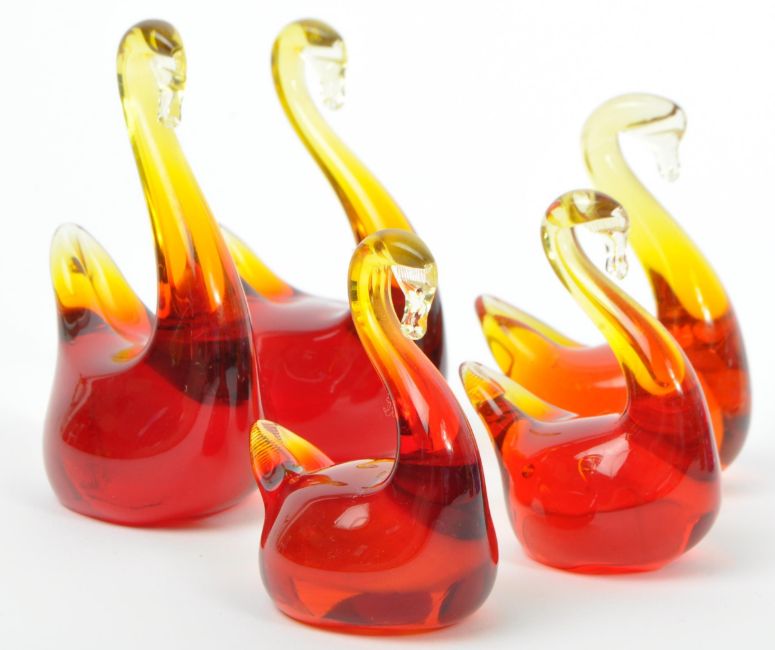 An assortment of 20th century glass to include a Scottish, Caithness paperweight in the 'Fireball' pattern, millefiori paperweights, a Langham bubble control example, a Murano glass example, a large bird shaped paperweight, hand blown Murano studio glass figures and a series of studio glass duck figures.
