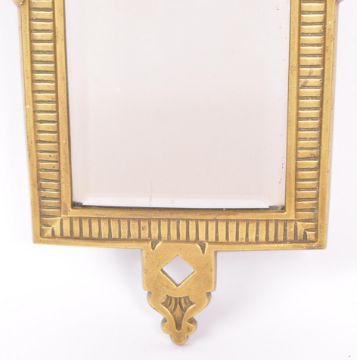 An early 20th century brass hanging wall mirror. Having a lion shield motif to top with scrolled foliate work decoration to sides. With a repeating pattern to border and bevelled edge glass. With registration shield mark to verso. Measures approx. 38cm x 18cm