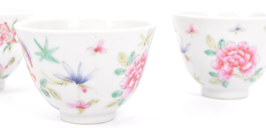 Four 19th century Chinese hand painted porcelain tea bowls. Each having a white ground and being hand painted with florals, butterflies and grasshoppers. Base unmarked. Measures 55mm tall.
