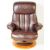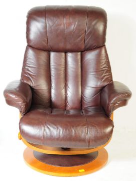A retro mid 20th century Ekornes stressless style reclining swivel armchair. Having a rectangular cushioned back with wing padded elbow rests. Raised on a bentwood circular base with matching stool. In a red / burgundy / oxblood colourway. Measures approx 108cm x 87cm x 82cm.