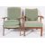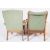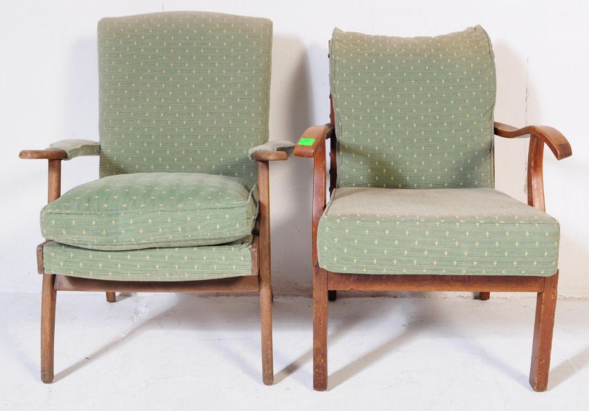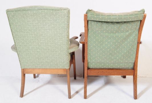 Parker Knoll Furniture  - Two Parker Knoll armchairs with teak wood frames and sprung base below cushions. One fully identified and marked as model 725, the other an earlier example with red makers plaque to underside. Both are upholstered in the same duck egg blue matching fabric. Measures approx, 90cm x 64cm x 68cm.