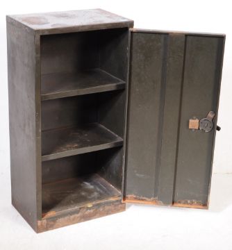 A retro mid 20th century engineers industrial workshop cabinet. Of rectangular form, metal construction with a single cupboard door opening to reveal a shelved interior with a pull handle. In a green colourway. Measures approx 91cm x 46cm x 30cm.