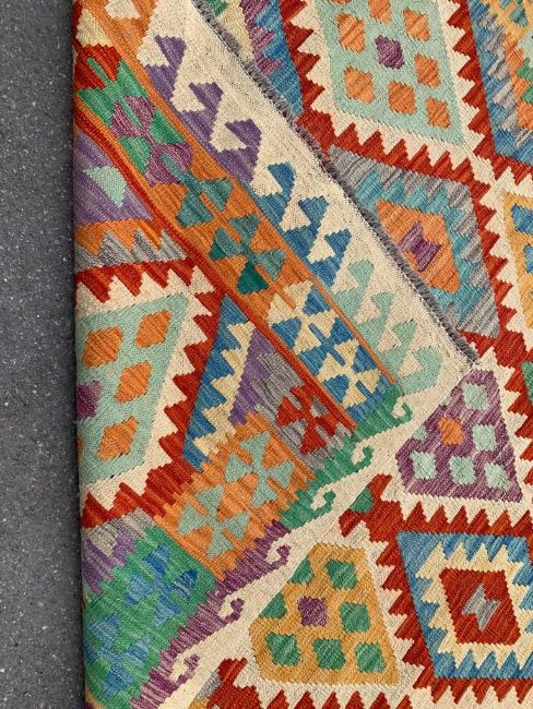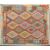 A 20th century Anatolian Turkish Kilim floor carpet rug. The rug having geometric lozenges in as variety of colours and a border of arkep type motifs to surround with tassels to ends. Measures 196cm x 158cm.
